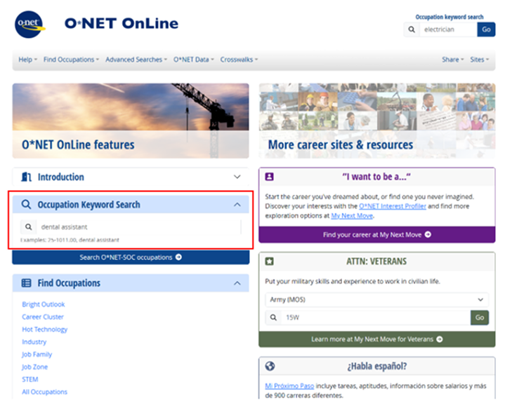 Once you’re in O*Net Online, there is an “Occupation Keyword Search” field where you can search for almost any mainstream occupation.
