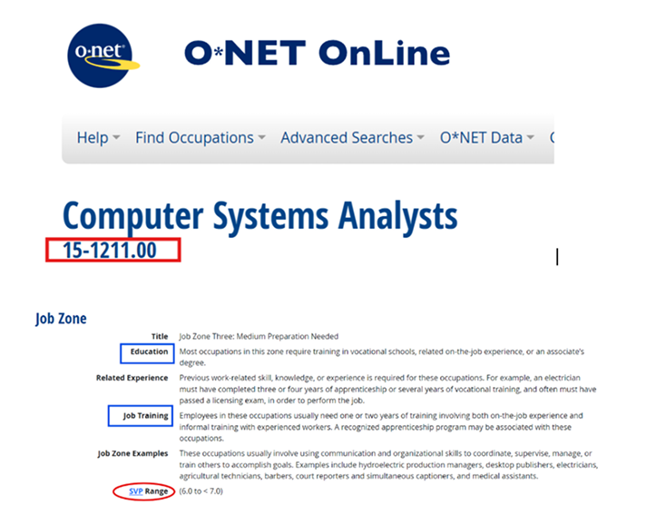 Use Job Training to see if the role typically needs a BA or substantial experience; Computer Systems Analyst shows ~1–2 years, implying lighter prep. SVP reflects skill level—aim for 7–8+ for BA-level roles; here it’s 6.0–<7.0, below that bar. Education outlines typical schooling (Associate’s ≈ 2 years; Bachelor’s ≈ 4 years, with common transfers). For EB-1, a required degree isn’t decisive—extraordinary ability can outweigh it. Example: “Financial Manager” maps to SOC 11-3031.00. My take: use SVP 7–8+ plus BA/experience as a quick filter, then confirm with training and education.