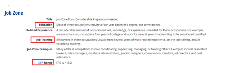 Next, scroll to “Job Zone.” Review Education, Job Training, and the SVP Range to understand preparation requirements.