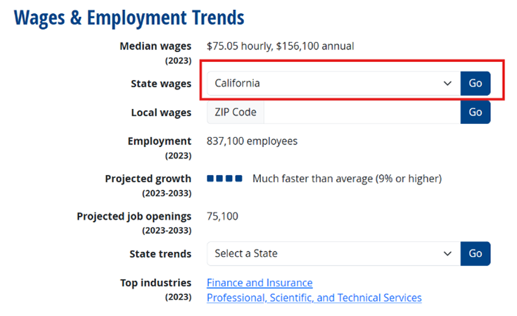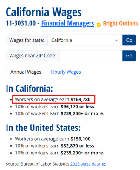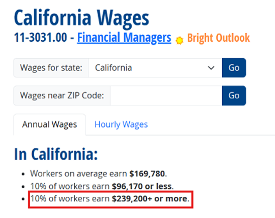 In this case, we’ve selected California. The median wage for a Financial Manager in California is $169,780. For EB-1 purposes, you will need to earn $239,200 or more to qualify in this category, as this is the amount those in the top 10% are currently able to command.